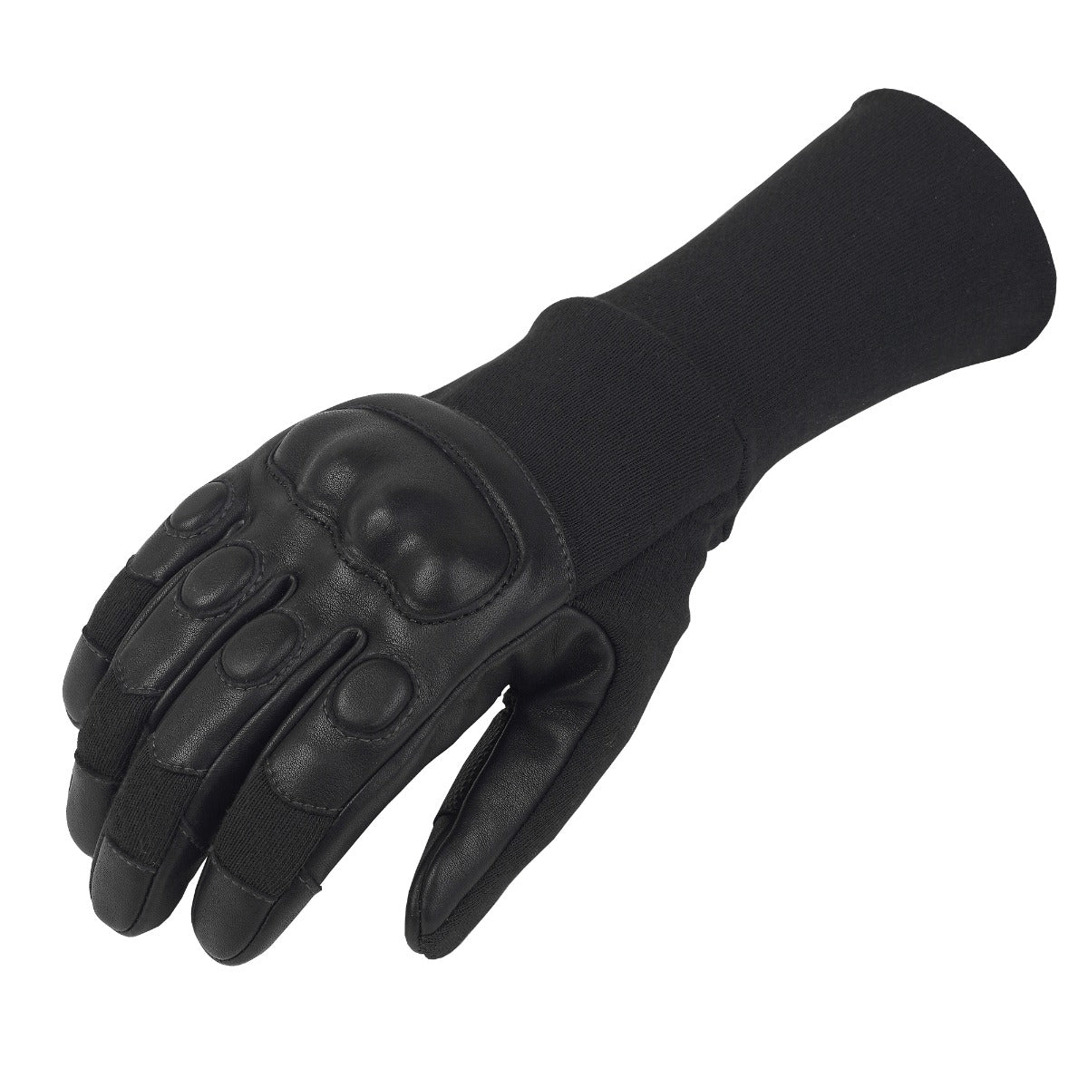Form and function combine in our latest model to be made available to police and military services. Used by Tactical teams within Met Police. Using a PYROHIDE cowhide leather palm combined with a knitted aramid fabric back and KOVENEX® lining, this close fitting gauntlet length glove provides wearers with high levels of dexterity as well as protection in a cutting edge design. Injection moulded hard knuckles and foam filled pads on the back of the hand offer impact protection while the elongated cuff protect users and ensure a secure fit around the arm.