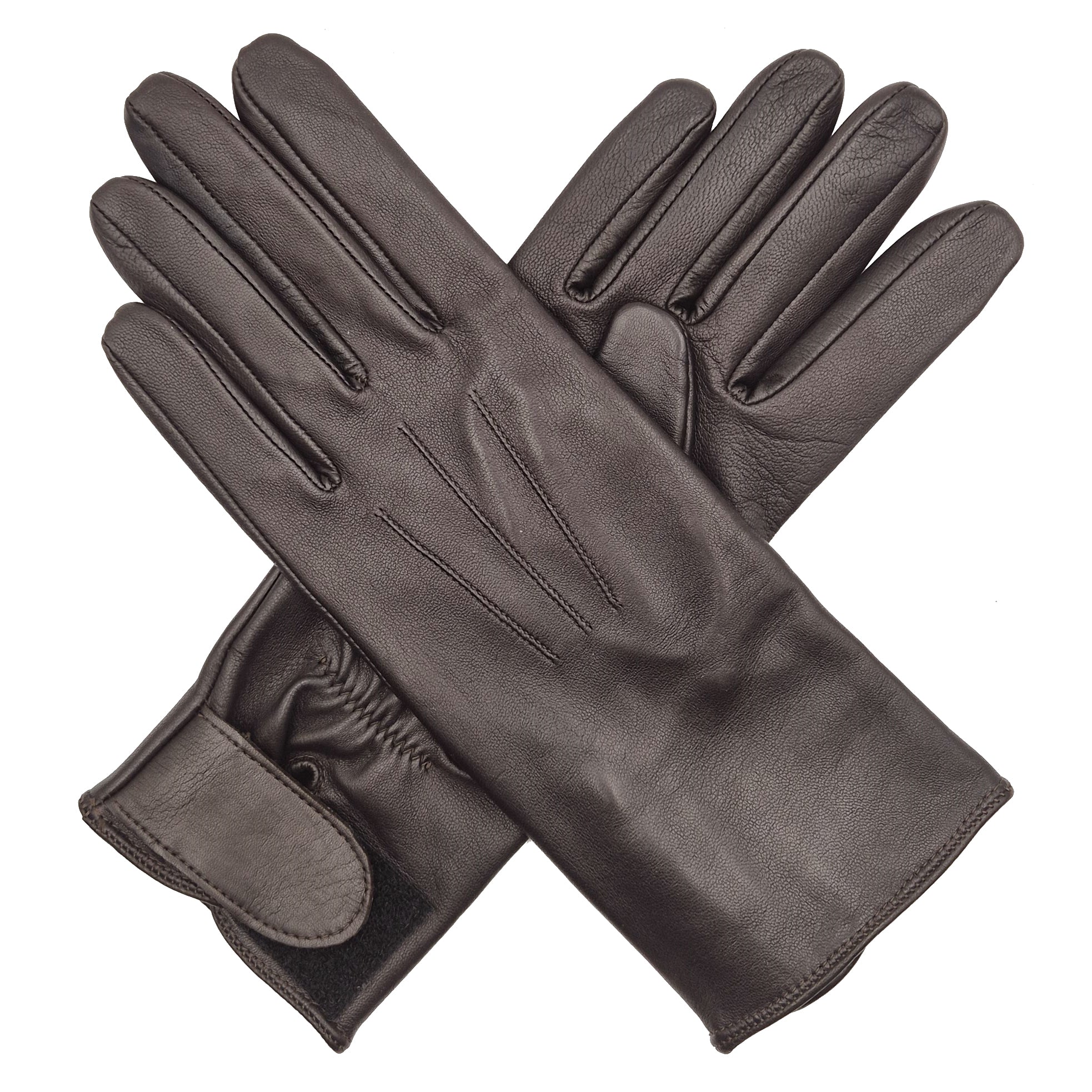 Table cut leather glove made from soft and thin English lamb nappa leather. Sewn inseam for a clean line with three hand sewn points on the back of each hand. On the palm side of the glove is a centre palm vent with a wide leather backed hook and loop adjustable fastener to secure the glove firmly around the wrist.