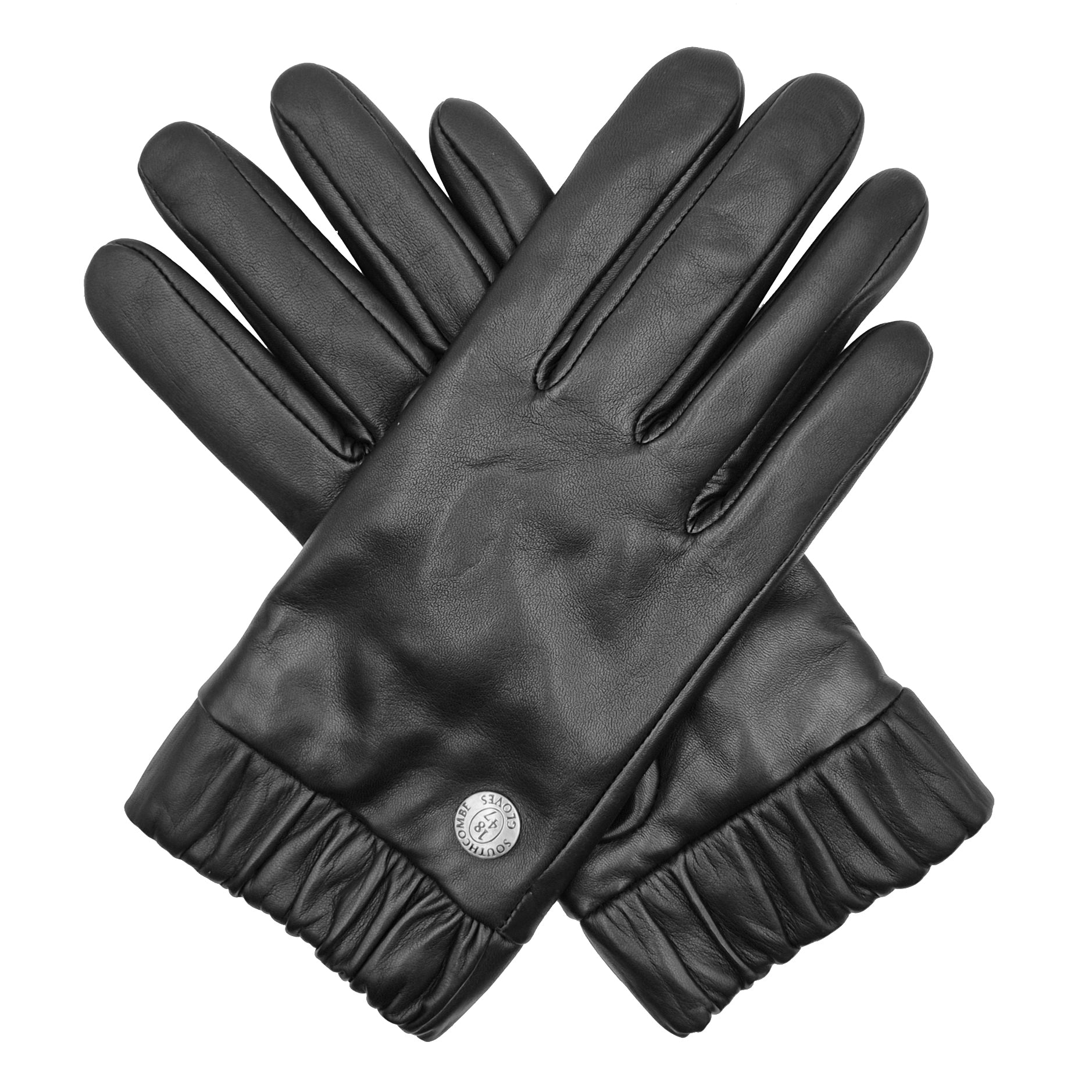 A little design to lift an everyday lined leather glove, this elasticaled leather ruched cuff deisgn is a truely unique design. Finished with a Southcombe silver dome on the back of each hand.