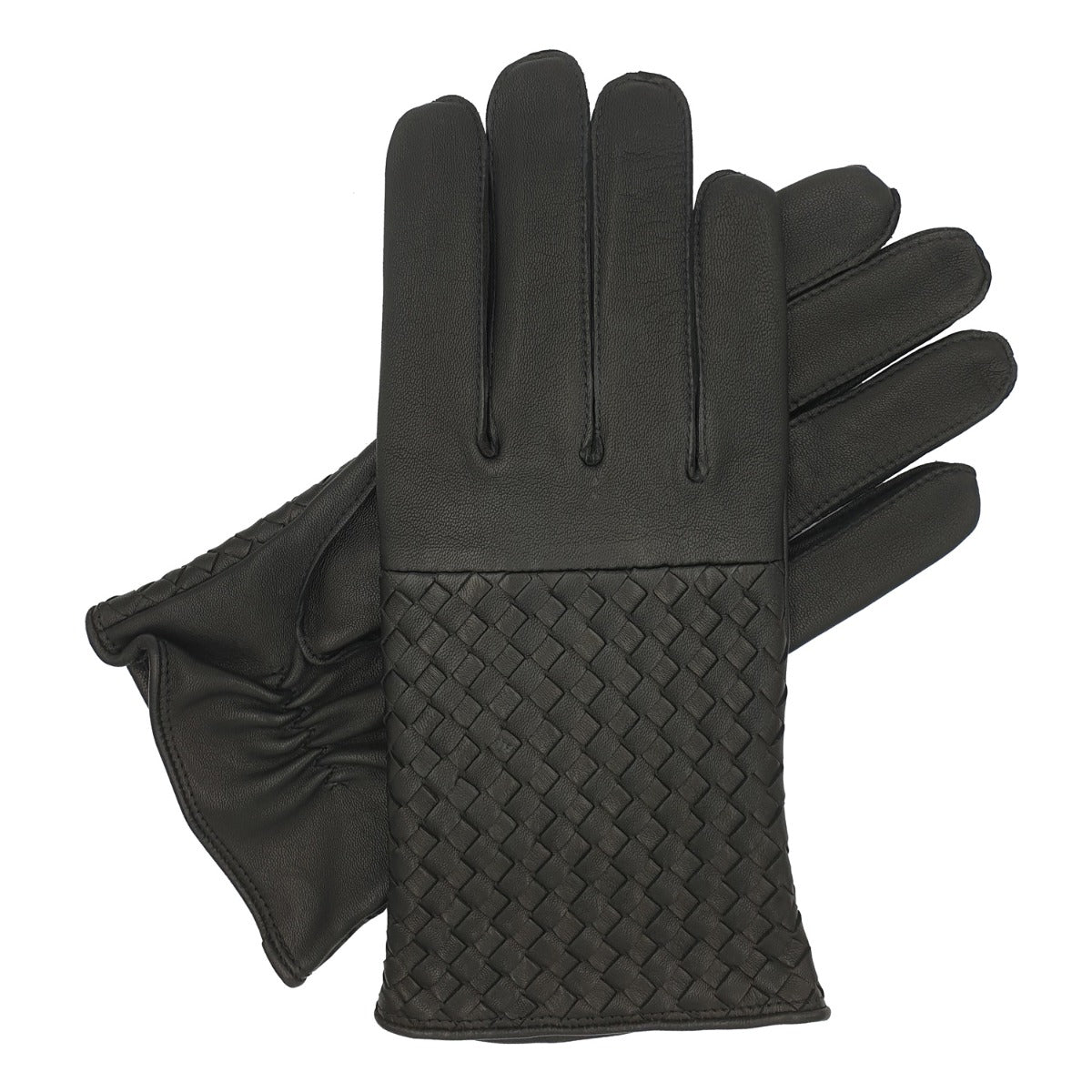 Men's black leather glove with woven leather back and silk lining