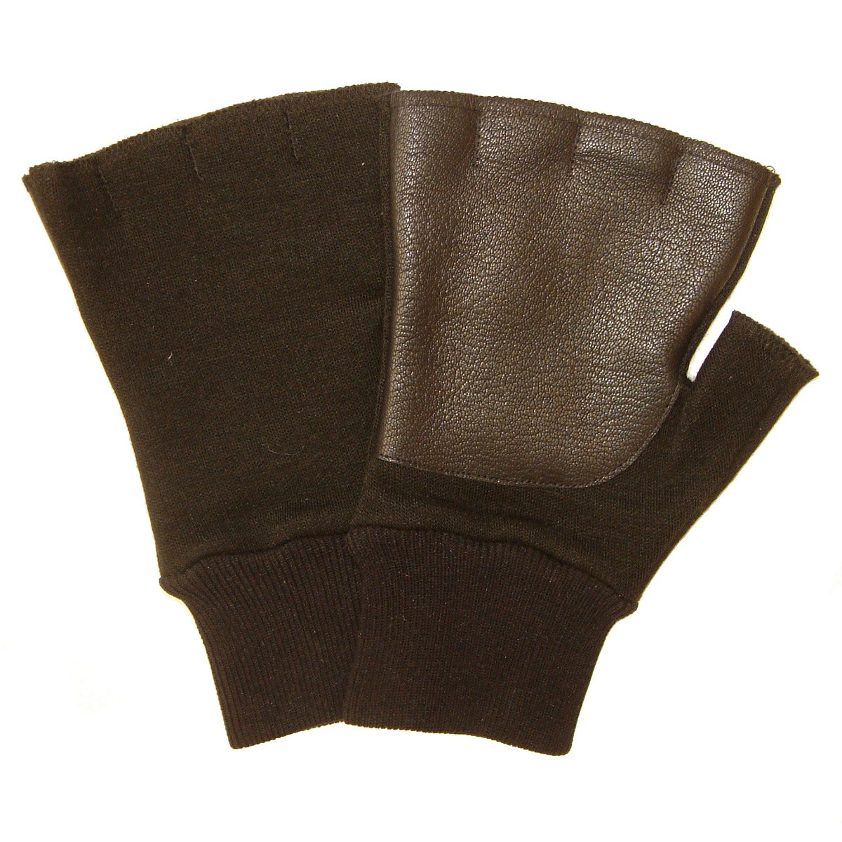 An unlined fingerless glove made from cotton fleece fabric which has been brushed on the reverse for comfort and warmth. The wristlet cuff is a 1 x 1 rib knitted nylon and the palm patch is grain leather. The design is worn by Technicians and Mechanics that require minimal protection and unhindered dexterity.
